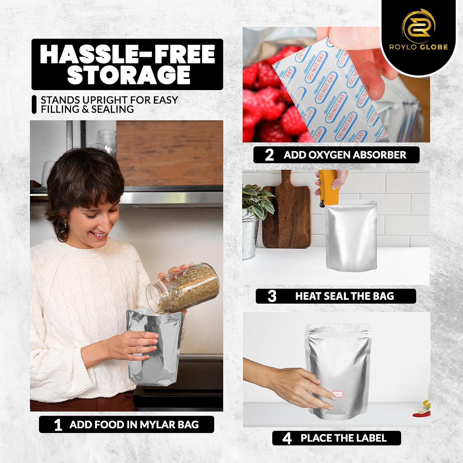 - EASY IN USE: Our mylar storage bags for food have a resealable feature, ensuring quick access to your stored items without any excitement. The easy-to-use resealable mylar bags adds an extra layer of convenience, providing a secure seal with minimal effort. Whether you're a kitchen pro or just getting started with food storage, long term mylar food storage bags with oxygen absorbers make the process hassle-free and make your life easier one snack at a time!