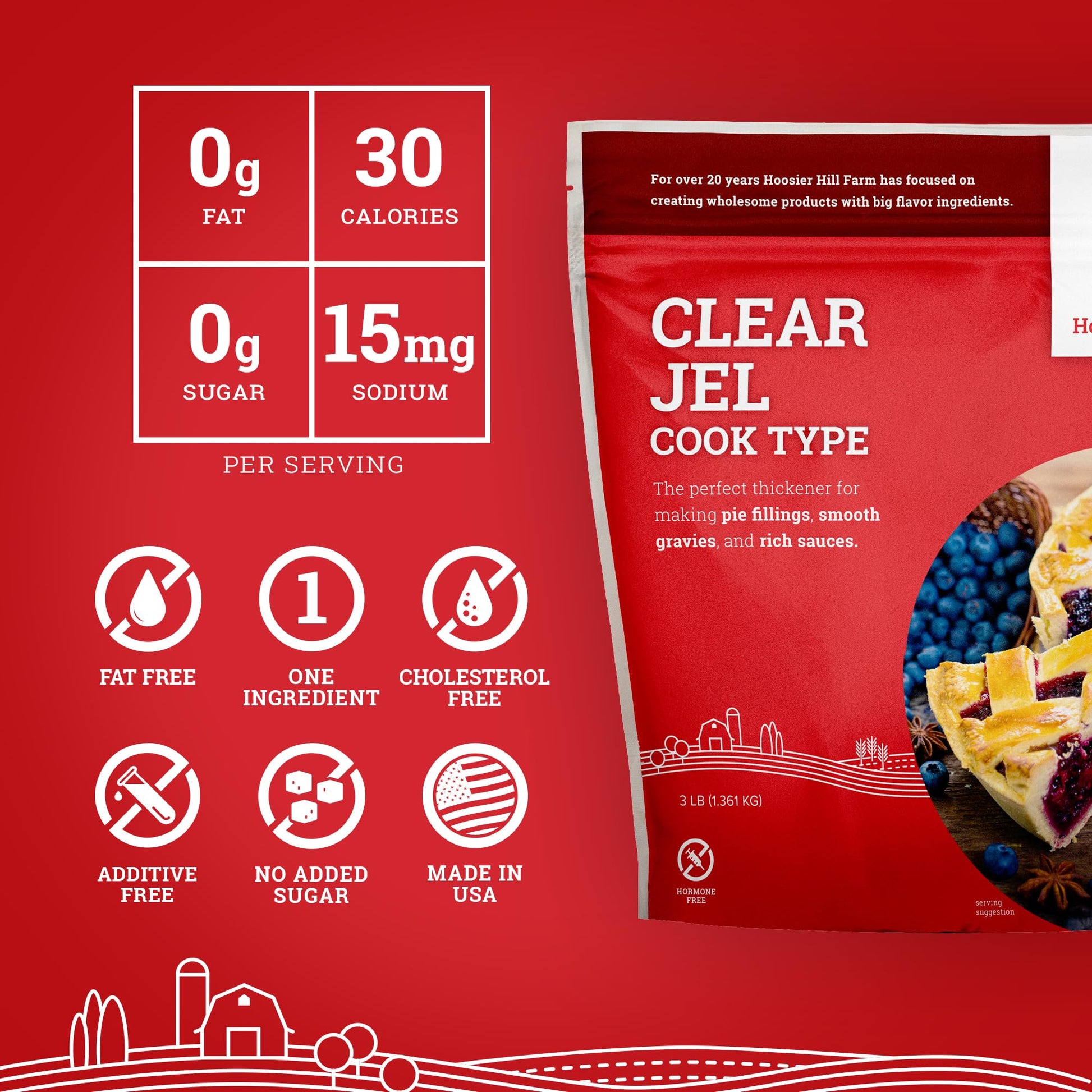 - Hoosier Hill Farm Clear Jel is a modified cornstarch that aids in thickening a variety of recipes. Our classic cook-type formulation has a great tolerance for high temperatures. This makes it ideal for canning fruit pie fillings and making smooth gravies and sauces.
