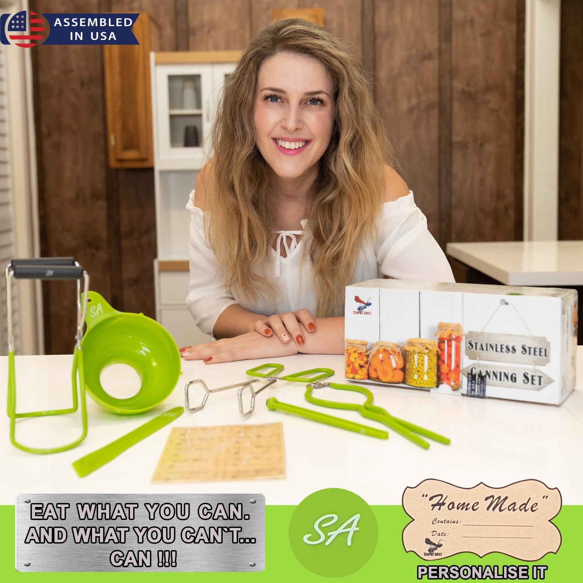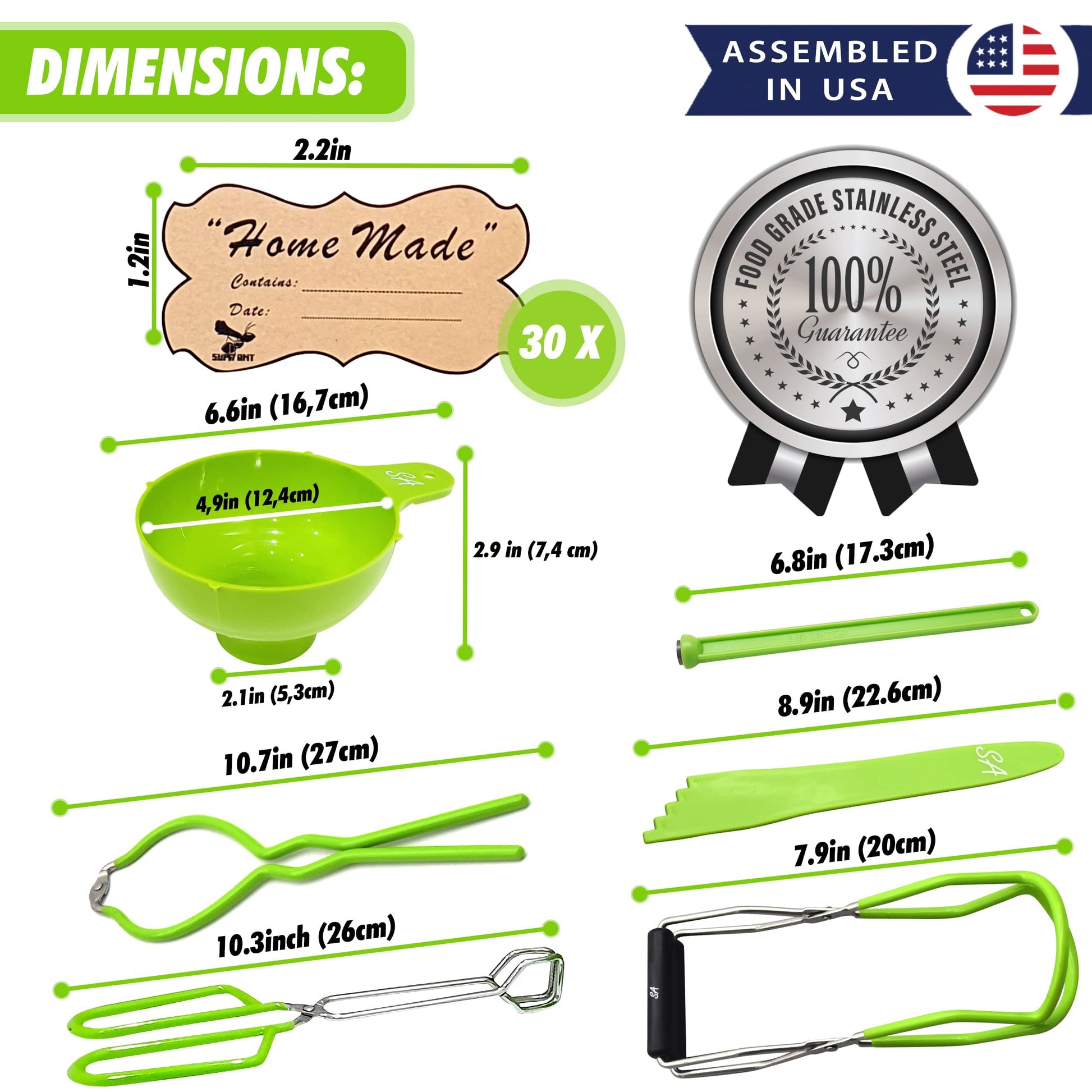 - High quality canning supplies starter kit + add ons to speed up the process (in green fluorescent color) - From homemade jam, pickles, sauces, salsas and stews to water bath canning, dehydration and other purposes with sturdy canning utensils and equipment for your piece of mind, all in a pleasant color to liven up the kitchen and make them more visible when you are looking for them and a box so you can store the set away until next time.