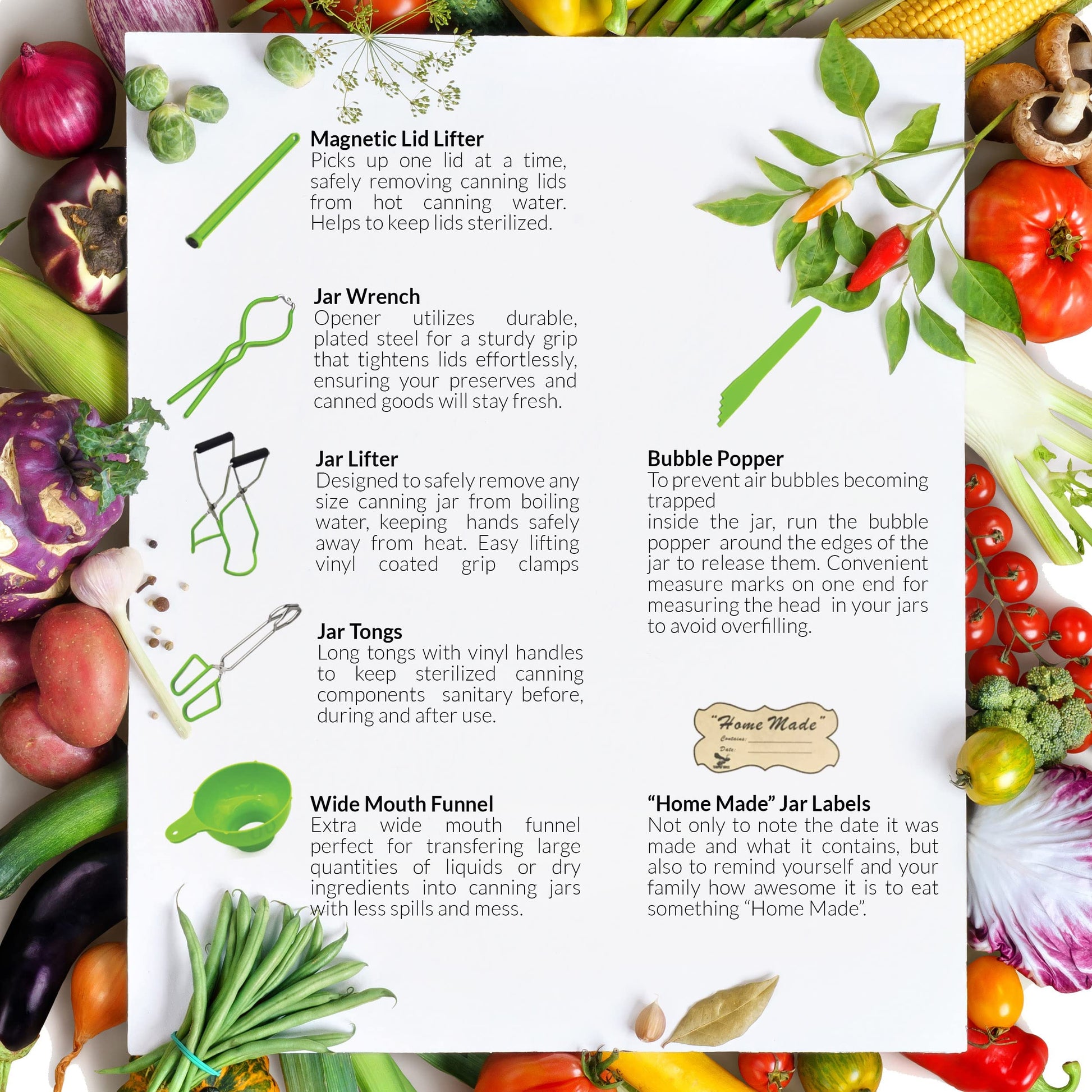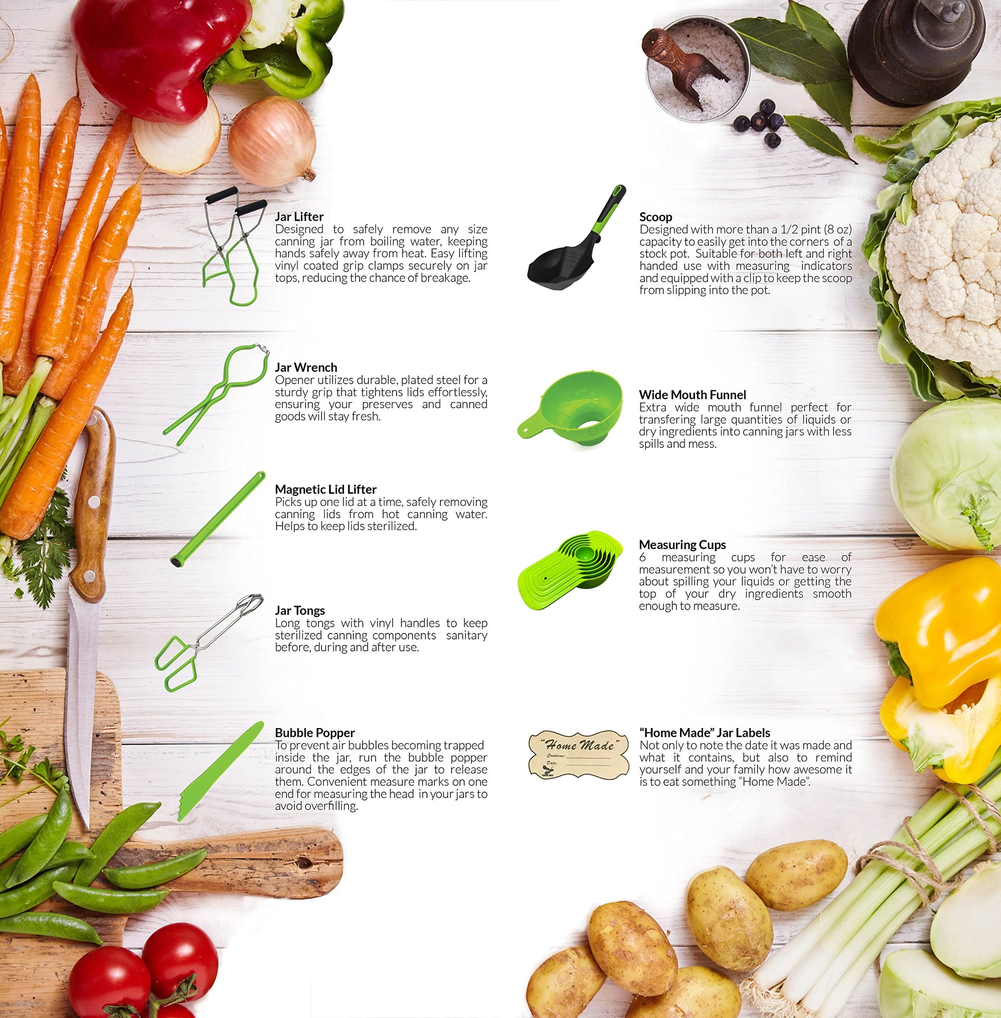 - All-in-one canning supplies - This home canning kit consists of all essential tools: canning funnel, jar lifter, bubble popper (measurer), magnetic lid lifter, jar wrench, canning tongs, largest canning scoop in the market (More than ½ Pint), 6 measuring cups and a set of "Homemade" labels to remind everyone of the hard work you have put in to make it :)